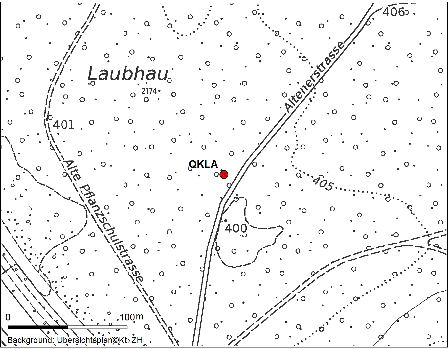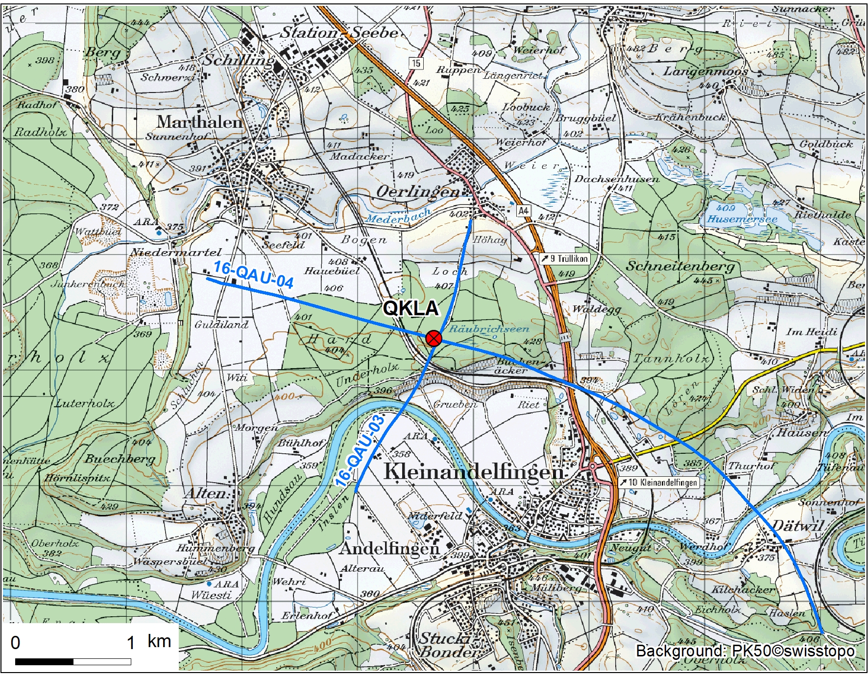 The borehole (Quartärbohrung, QBO) at Kleinandelfingen-Laubhau (QBO Kleinandelfingen- Laubhau / QKLA, Tab. 1) is part of Nagra's Quaternary investigation programme (QAU; Nagra 2018a). The drill site was chosen to constrain the bedrock geometry and the valley fill of the Marthalen Trough (Fig. 1 and 2). The borehole QKLA was positioned near the crossing of 2D reflection seismic lines 16-QAU-03 and -04 and near the centre of the Marthalen Trough as constrained by 2D reflection seismic data (Nagra 2018b). It was conducted in the period from 1.10.2019 – 10.12.2019 using a combination of Düsterloh Hammer, Prakla coring and wire-line drilling with a triple-tube core-barrel, i.e. with a plastic core liner.
