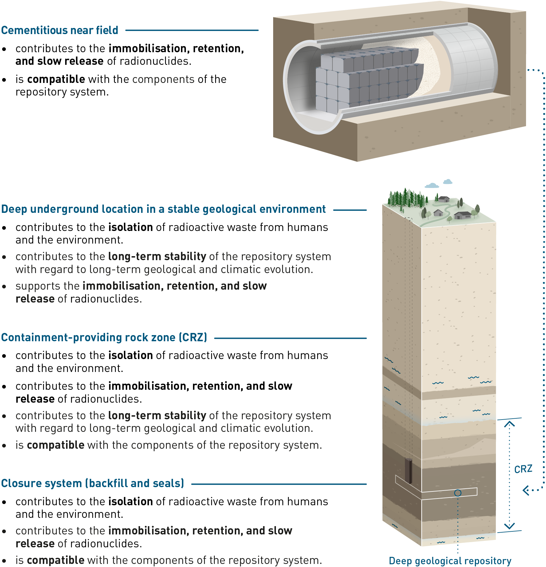 These safety functions are used to derive a set of safety requirements on the system components, including the “pillars of safety” described below. In the current repository design the safety functions are provided by the elements of the multi-barrier system. Future changes to the system remain possible as there is no single solution for how to provide these safety functions.